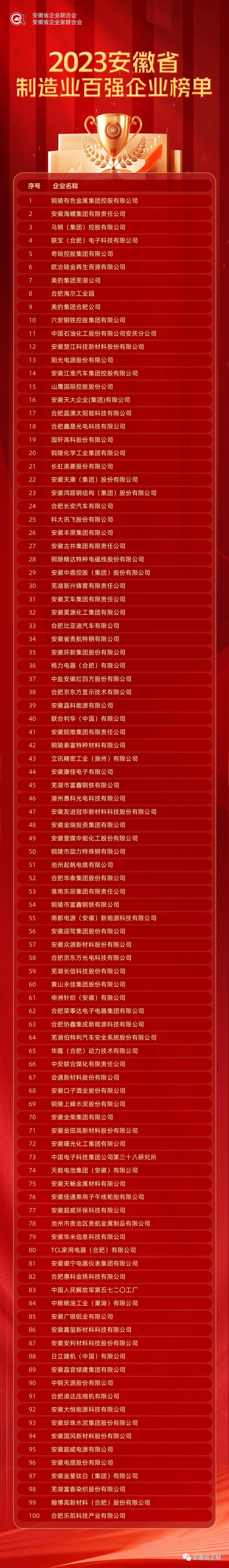 為全面貫徹習(xí)近平新時代中國特色社會主義思想和黨的二十大精神,著力推動我省企業(yè)高質(zhì)量發(fā)展,促進(jìn)企業(yè)做強(qiáng)做優(yōu)做大,并為社會各界提供安徽大企業(yè)發(fā)展的數(shù)據(jù)信息,今年,我會連續(xù)第十九次在全省開展了安徽企業(yè)100強(qiáng)申報排序活動。根據(jù)企業(yè)自愿申報,有關(guān)機(jī)構(gòu)確認(rèn),以2022年企業(yè)營業(yè)收入為標(biāo)準(zhǔn),經(jīng)審定,確定了安徽企業(yè)綜合100強(qiáng)和制造業(yè)、服務(wù)業(yè)企業(yè)100強(qiáng)?,F(xiàn)將名單予以公布(詳見附件)。