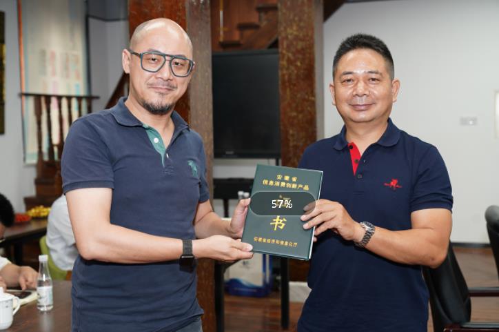 會(huì)議開(kāi)始前,鏡湖區(qū)經(jīng)信局局長(zhǎng)方仲明向企業(yè)授予安徽省第七批信息消費(fèi)創(chuàng)新產(chǎn)品證書(shū)。